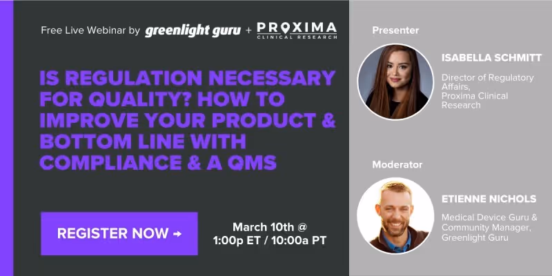 Greenlight Guru is hosting a free, live webinar with Isabella Schmitt, who will help you understand how comprehensive regulation and standards have reshaped the medical device and drug landscape by improving the efficiency of the product development process. They ensure your product functions according to its intended use and keep the end-user safe. Following regulations/standards and having a robust QMS, cuts down on manufacturing delays and product recalls, saving you time and money.